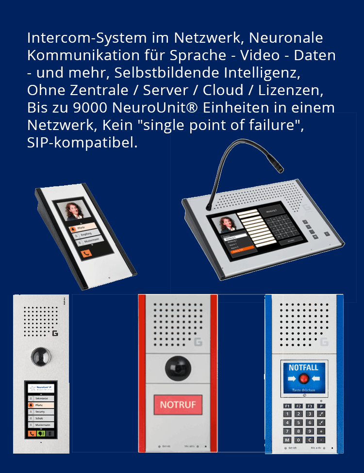 STATUS: Complete product range with control center, built-in, wall, table, door, stainless steel intercom stations as well as interfaces to mobile communications, fault reporting systems, etc. Software for a wide range of applications.